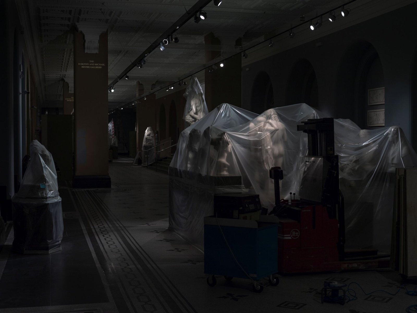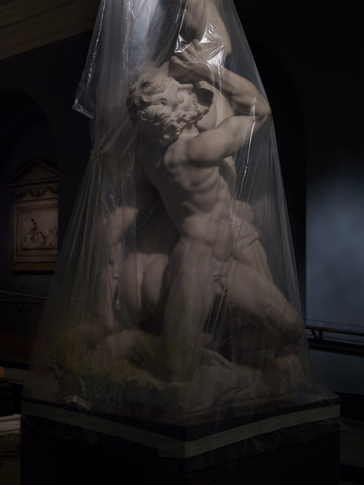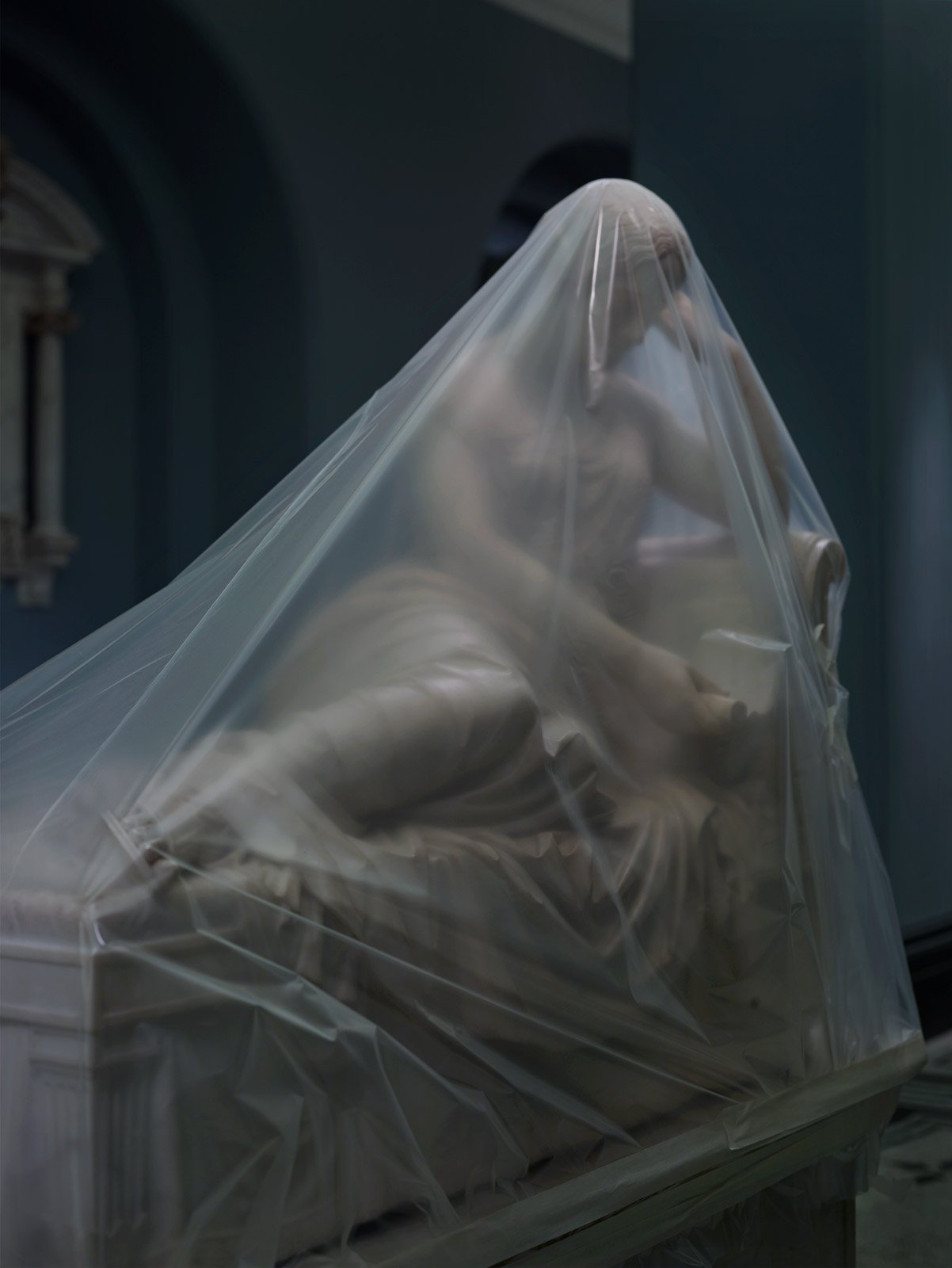 In this exhibition, Roberts abandons his usual style of landscape photography to focus on more intimate work. The 12 shots on display portray the marble sculptures of the Victoria and Albert Museum, illuminated only by night light, protected by plastic sheets during the renovation works and closed to the public due to the pandemic.