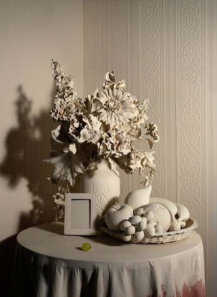 Passionate about sculpture-objects, Jonny elevates them to the main protagonists of his work and through them he tells us his story: childhood in the Berkshire woods, family with its burden of affections, apprehensions, conflicts, an authoritarian father, the tolerant mother, four older sisters to safeguard little Jonny who however cannot imitate them; all reinterpreted through some overshooting or subtle perversities in the Gothic Novel style. A true personal diary of images which, through continuous self-analysis, leads the viewer on an engaging, sometimes uncanny journey, which brings the dimension of reality closer to that of the unreal. It is clear, from the very first glance, how the large format makes his compositions stand out to the fullest, created with an almost maniacal precision.
